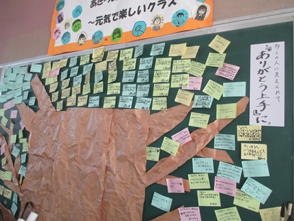 5年2組の教室をのぞくと、大きな木が出来上がっていました。これは、道徳「『ありがとう上手』に」の学習の延長で、児童がいろいろなありがとうを付箋に書き込んだものです。いろいろな人や出来事にたいしてたくさんのありがとうが書かれています。