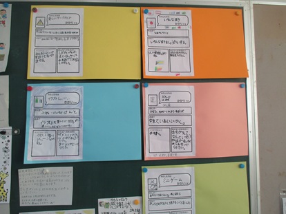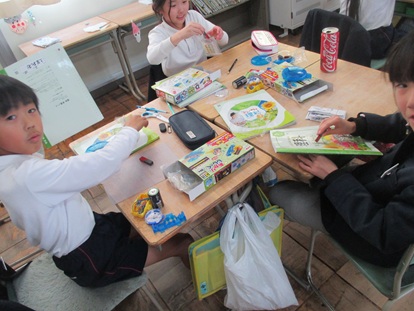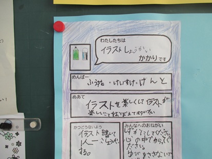 係は1組、2組それぞれ違っており、「イラストしょうかい」「かんじはかせ」「いろんな国き」「びっくりマジック」「おもしろ絵本」など様々あります。