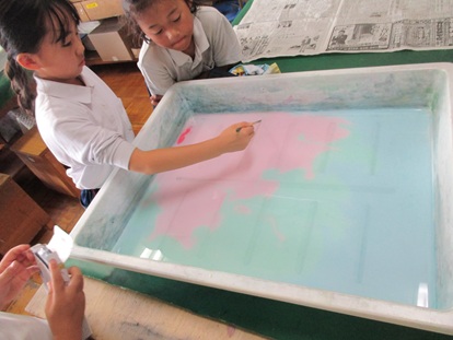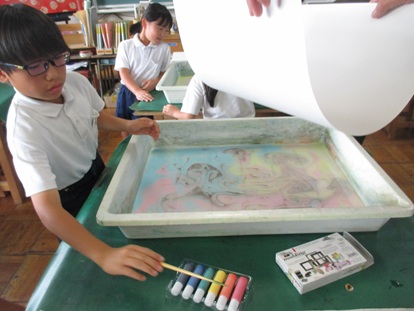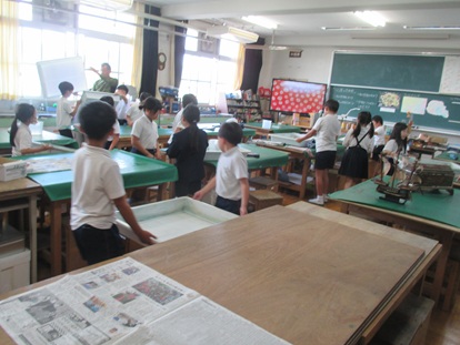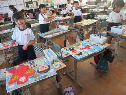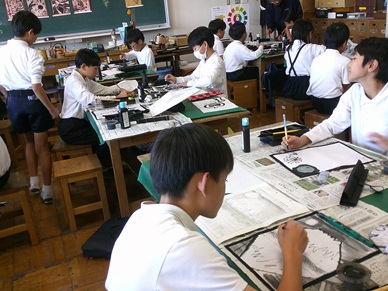 4月24日(木曜日)図工室では、4年生が「まぼろしの花」を描いていました。黒い画用紙に白いコンテを使って描いています。