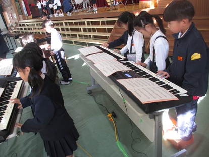 11月11日(火曜日)プログラム7番 全校合唱「手のひらを太陽に」、8番 リコーダー奏「ふるさと」の練習を行いました。
