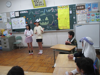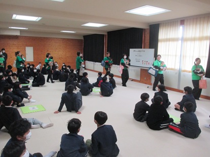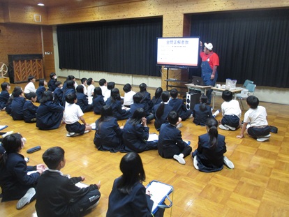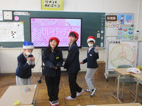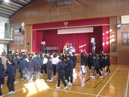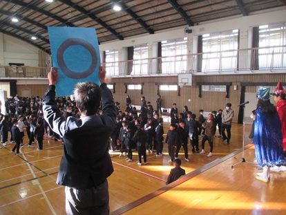 12月9日(火曜日)児童集会を行いました。特別ゲストピッカリ星人が登場して、マルバツクイズをしました。