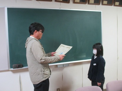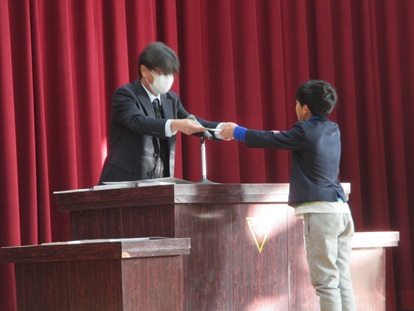 朝会をリモート(ClassroomのMeet)で行いました。選任式では、1学期の学級委員と計画委員の代表が選任状を受け取りました。