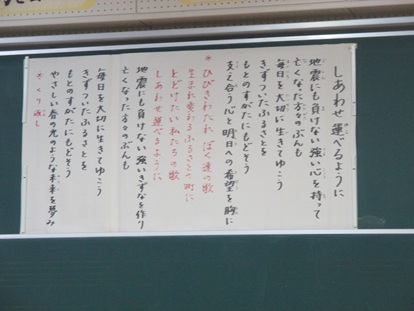 1月19日(月曜日)西神吉小学校の2年生は、初めて「しあわせ運べるように」を歌いました。初めてでしたが、とてもきれいな歌声が教室に響き渡りました。