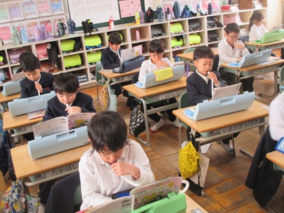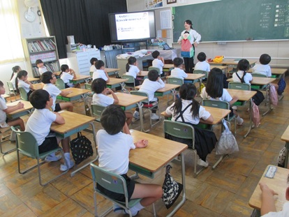せなかは「ぴん」、あしは「ぺた」、手は「とん」とおさえる。1年生は、つくえに座って書く時の姿勢を学びました。