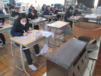 3年生 「会議室で社会科の学習」 30年前、50年前の学校はどんな様子だったのかを学習しています。