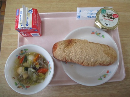 2月12日(木曜日)今日の給食のメニューは、「おうごんパン、ぎゅうにゅう、タイピーエン、ヨーグルト」でした。