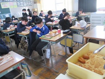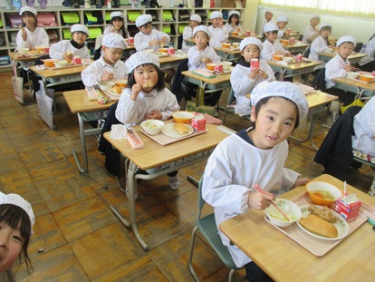 今日のメニューは、「ごはん、ぎゅうにゅう、、かきたまじる、いわしのしょうがに、きんぴらごぼう」です。「おいしいですか?」の問いかけに・・・「はーい!」と元気な声が返ってきました。