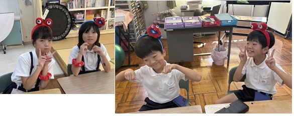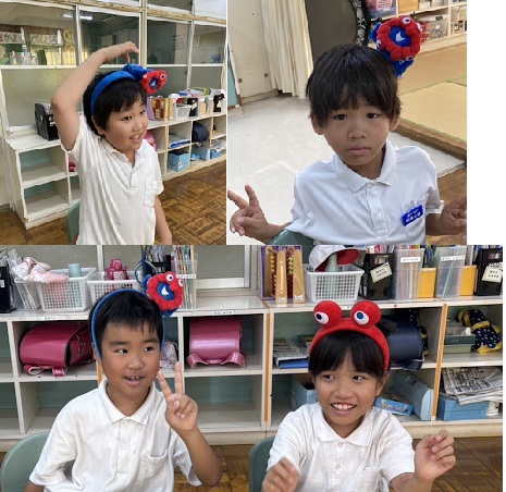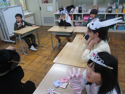 6年生から王冠、5年生からポシェットをプレゼントされました。ポシェットには、学校探検の案内状(2年生より)、雨の日にじゃんけんできるカード(3年生より)、クイズカード(4年生より)が入っていました。使うのが楽しみです。