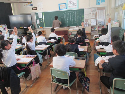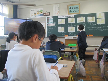 5年生は国語科で「自然環境を守るために」を学習しています。めあては「自分が関心のある環境問題について調べ、考えたことを説得力のある文章で書こう」です。
