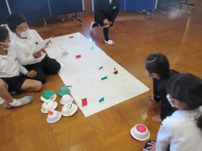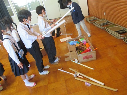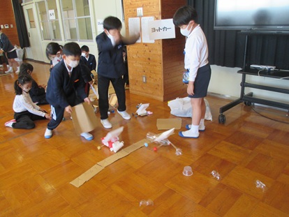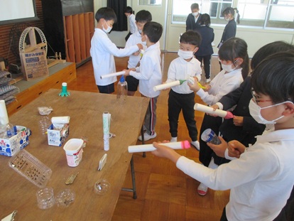 2年生は、生活科の時間に、自分たちで遊びを考え、段ボールや牛乳パック等で手作りおもちゃを準備してきました。