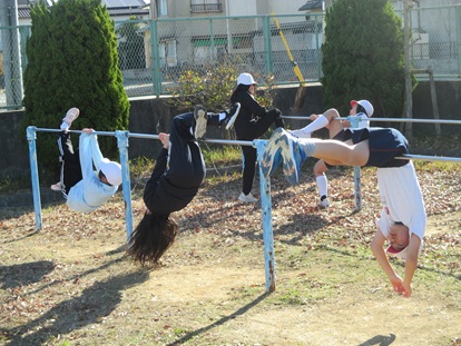 急に気温が下がり、真冬並みの気候となりました。5年生は体育で鉄棒をしています。ペアで技を確認し合っています。