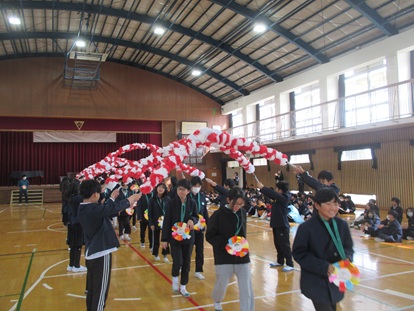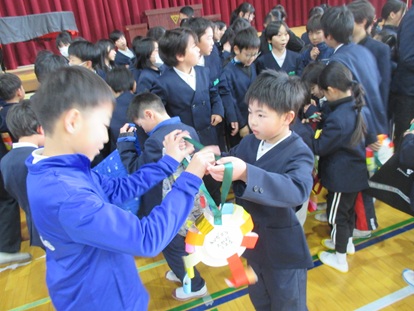 2月27日(金曜日) 6年生を送る会を実施しました。各学年から歌やクイズなどの出し物がありました。 1年生からは「ありがとうメダル」と歌「ありがとうの花」を送りました。