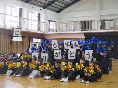 各学年から6年生へ、「ありがとう」の気持ちを込めた歌やダンスなどが行われ、体育館がとてもあたたかい雰囲気に包まれました。5年生の計画委員会の皆さん、準備から進行までありがとう。