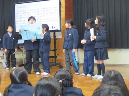 オープンスクールに向けてどの学年も準備が進んでいます。今日は、5年生の発表練習を4年生が見に行きました。発表の後半に「自然学校のスライド」が流れ、5年生は思い出を振り返るように、4年生は期待を膨らませながら見ていました。
