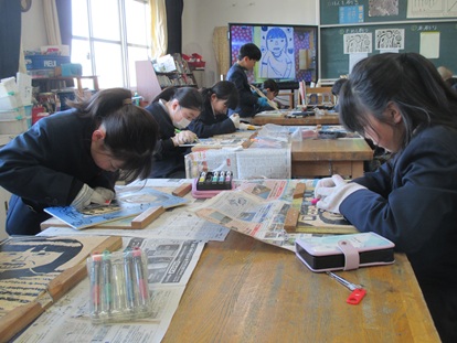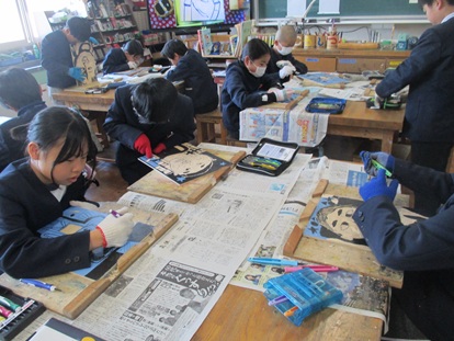 4年生は、木版画「私のベストショット」を制作しています。