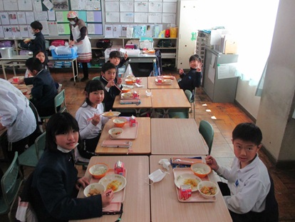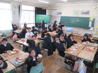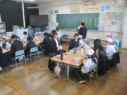 3月10日(火曜日)になかよし給食を行いました。なかよし給食は、ペア学年(1・6年 2・4年 3・5年)でクラスの半分ずつが教室を入れ替わって給食を行います。