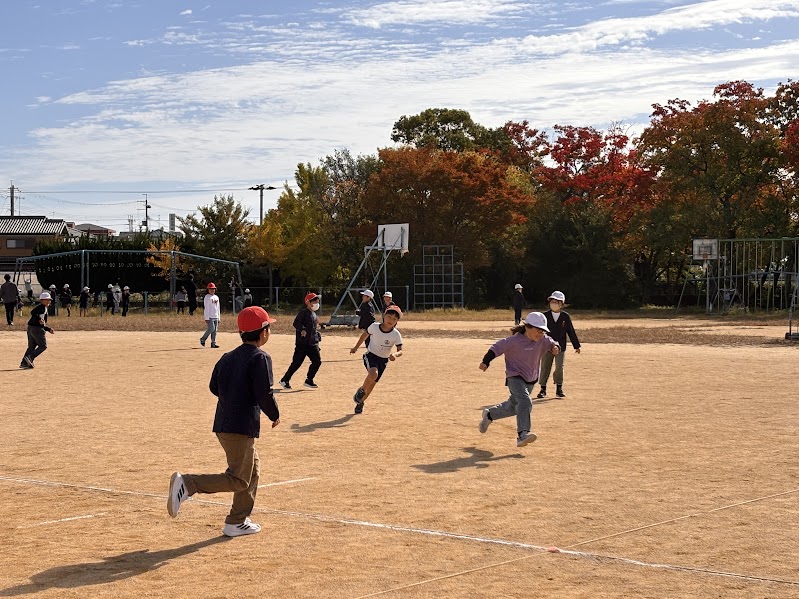 秋晴れの空の下で鬼ごっこをしたりドッジボールをしたり楽しく遊びました。