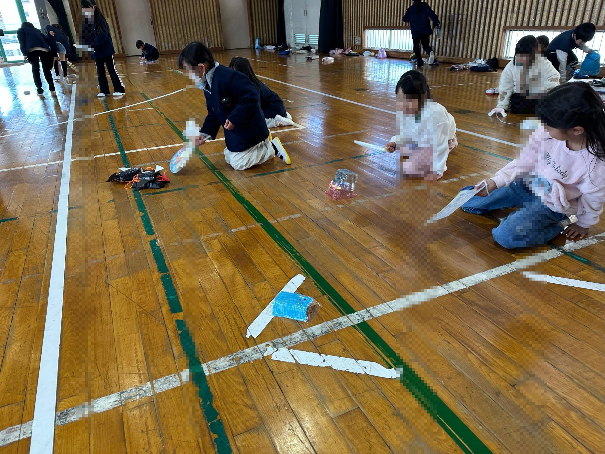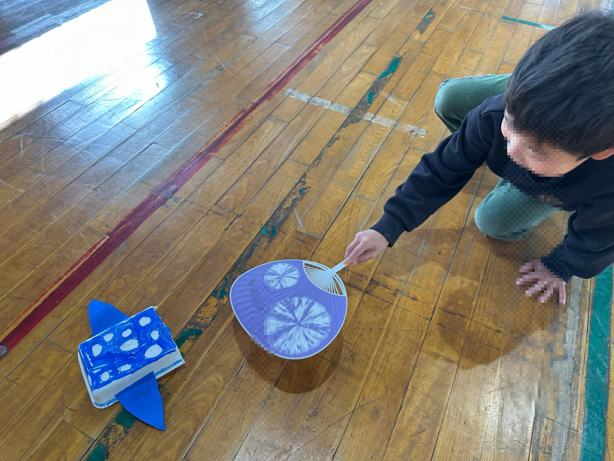 完成後、体育館へ行き、みんなで楽しく遊びました。風を送るとふわっふわっと前へ進むのをとても喜んでいました。