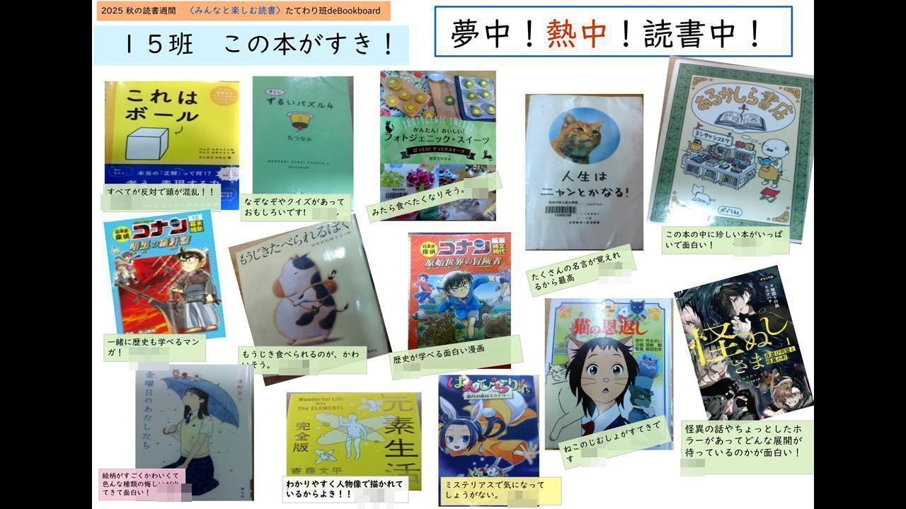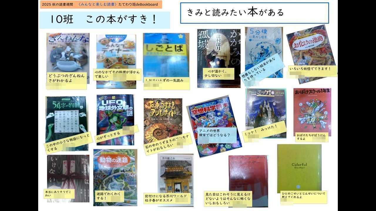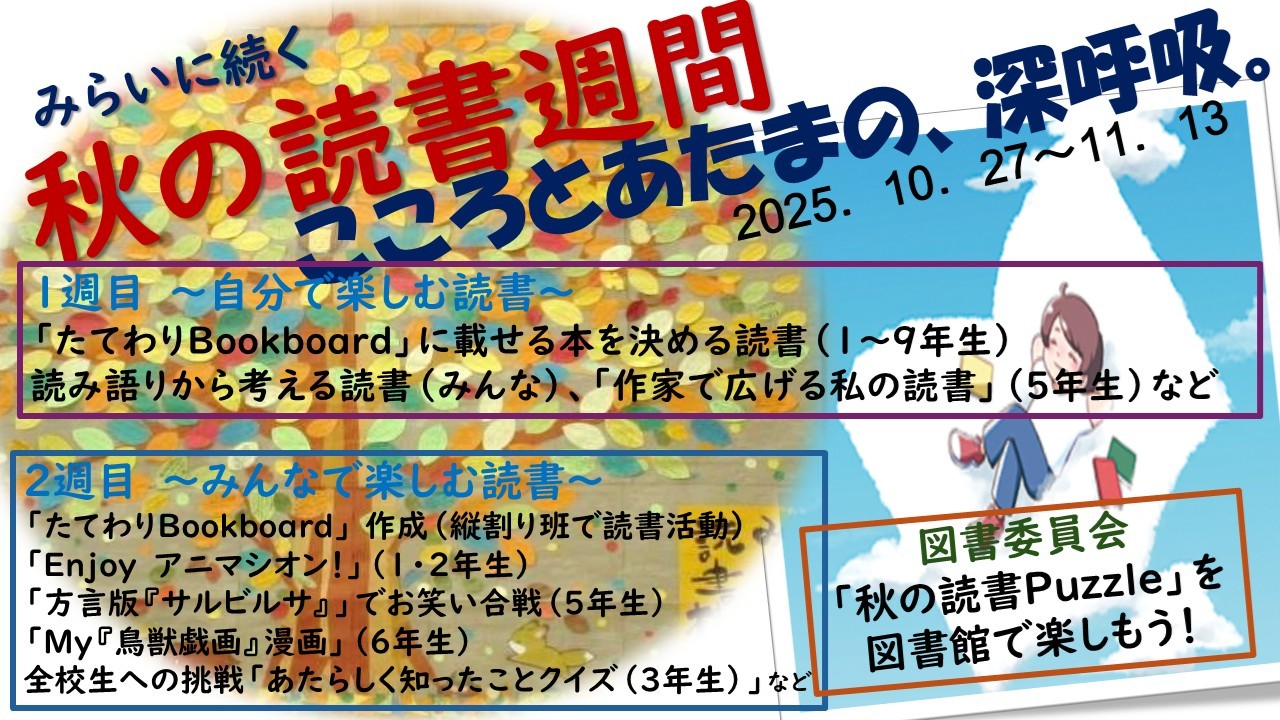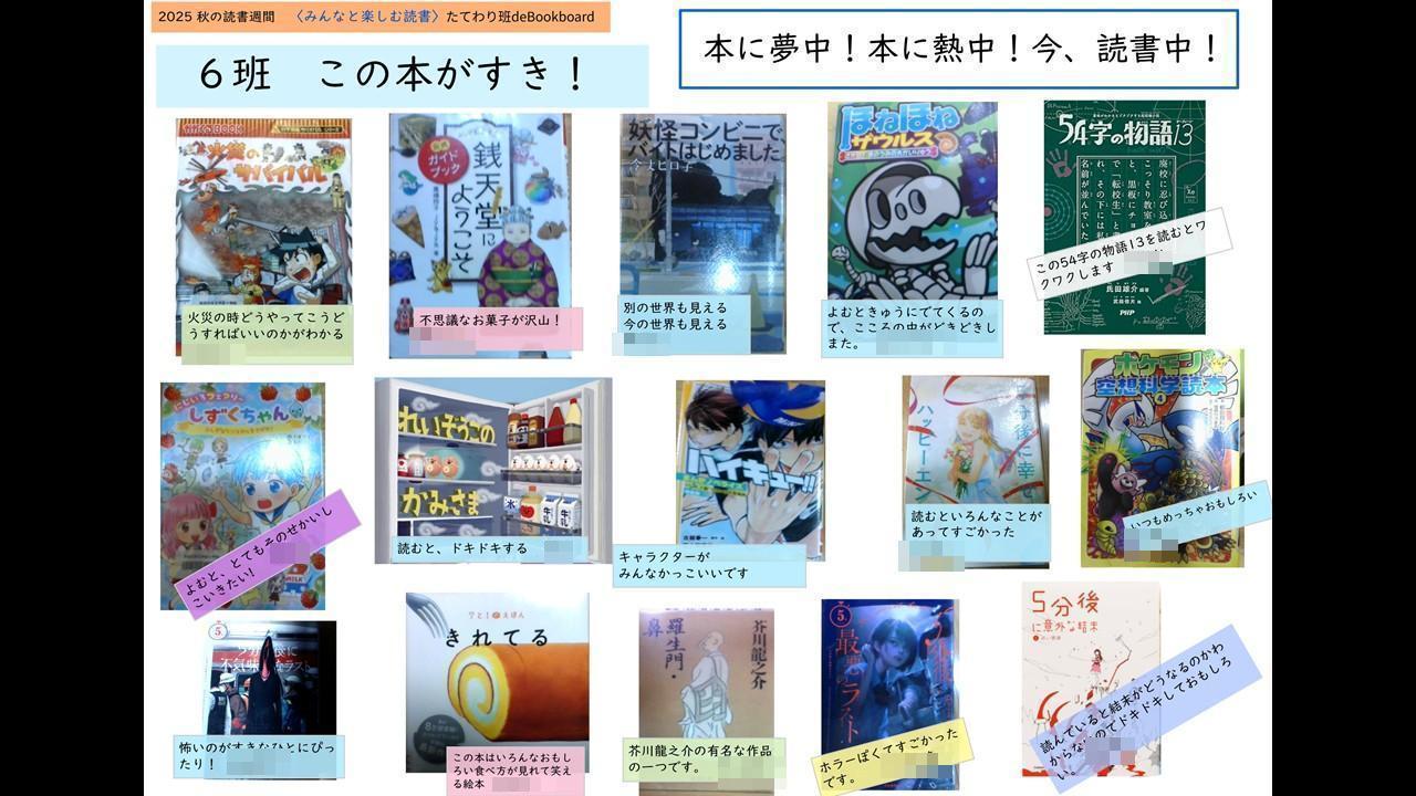 10月27日から11月13日まで秋の読書週間を行いました。途中、インフルエンザの流行により、計画を見直すこともありましたが、明日の「縦割りBookboard」以外にも、いっぱい読書活動がありますのでいくつか紹介します。
