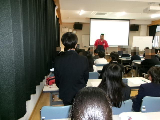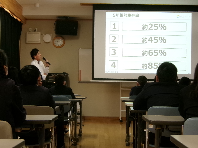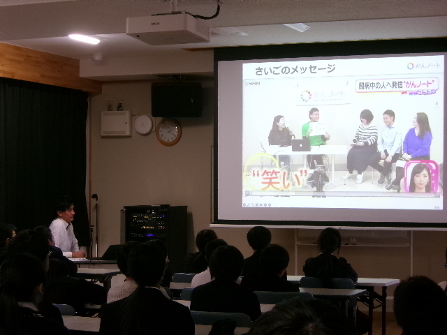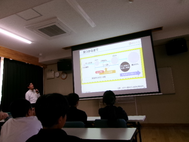 今日は東京から、岸田さんをゲストティーチャーにお招きして がんについてのお話を聞きました。岸田さんはアヒルで有名な大手がん保険会社のCMにも出ておられるいわゆるがん経験者で、がん患者さんとのトークを笑いとともにネットで配信しておられる”がんノート”という活動をされています。今日の授業もがん経験者としてのメッセージをときには笑いをいれながら授業をしてくださいました。