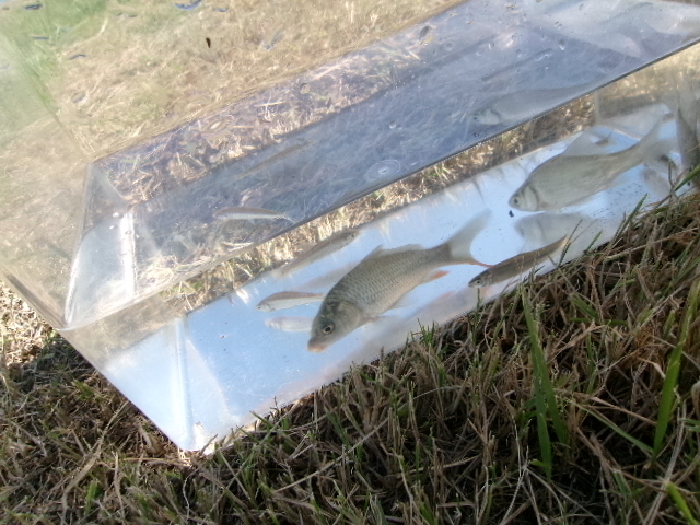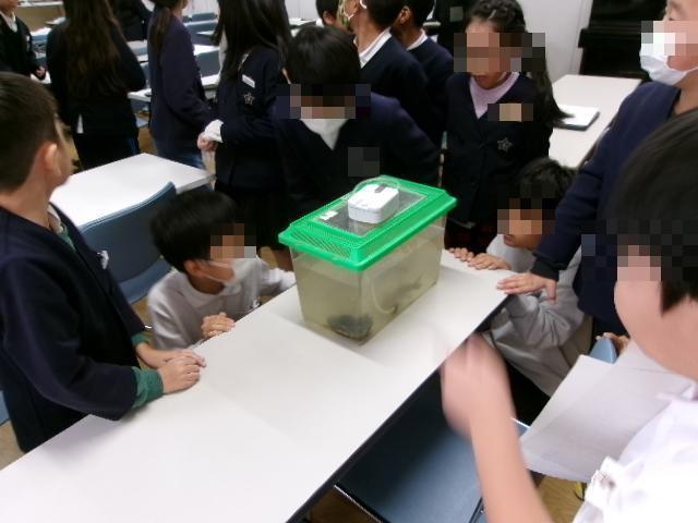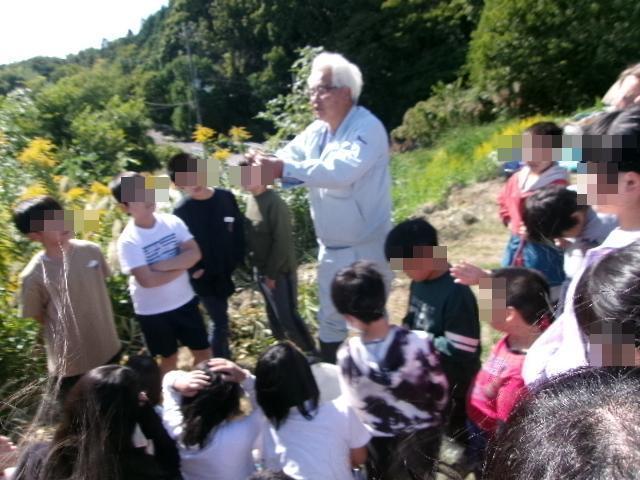 上荘地区に数多くあるため池を紹介いただいたあと、ため池の働きとして「防災」「地域の保存食」「水田や畑の肥料」「憩いの場」があること、かいぼりの役目やじゃこ獲りの目的などを教えていただきました。子どもたちは事前に「聞きたいこと」をお伝えしていたので、それらも一つ一つ答えてくださいました。また、下池の生物を実際に持ってくださり、それをみんなに見せていただきました。