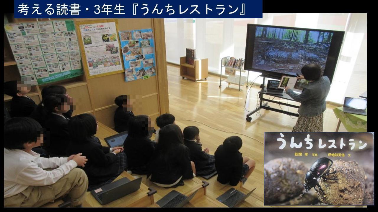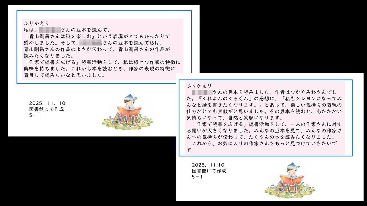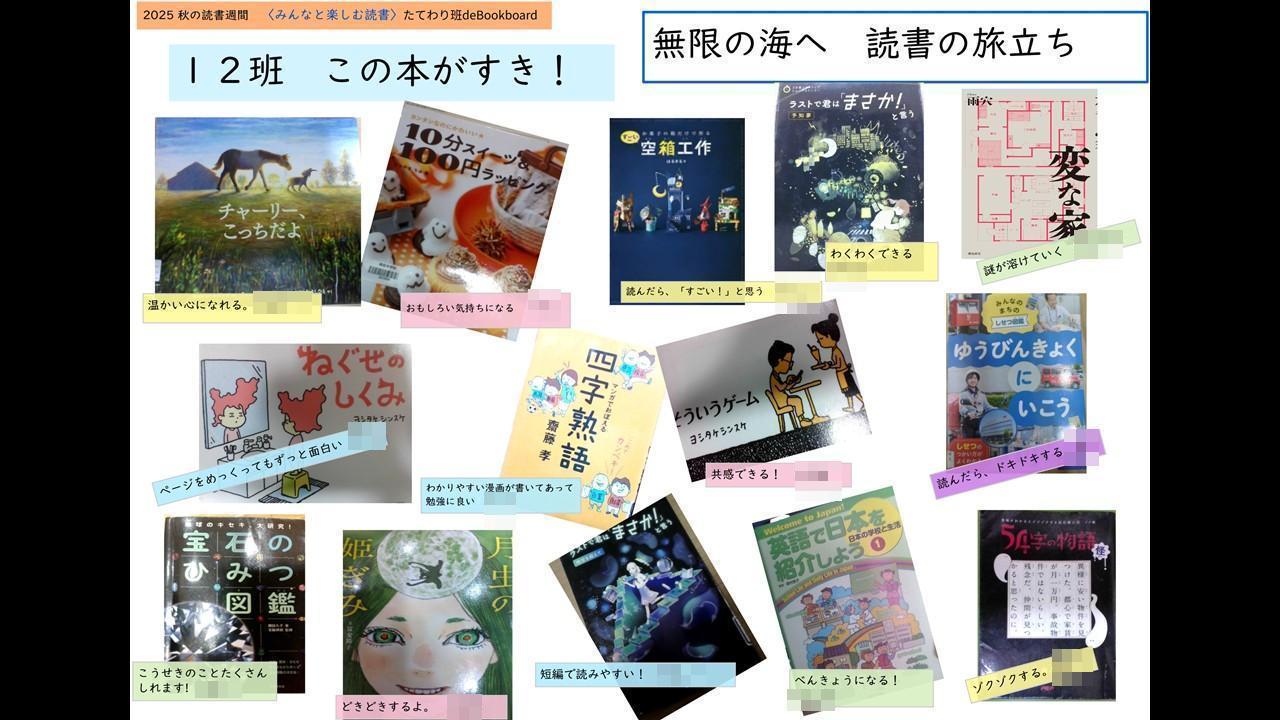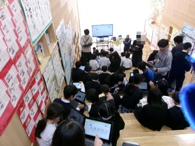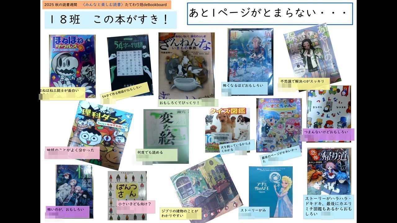 最後には全部の班の作品をショートムービーで紹介されました。ほかの縦割り班のBookboardからも画面上で情報をキャッチ!1時間目の前の朝の短い時間でしたが、読書への興味関心が刺激される時間となりました。