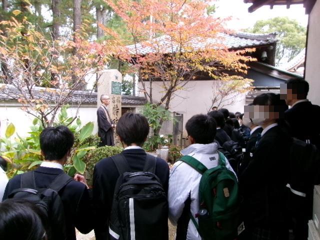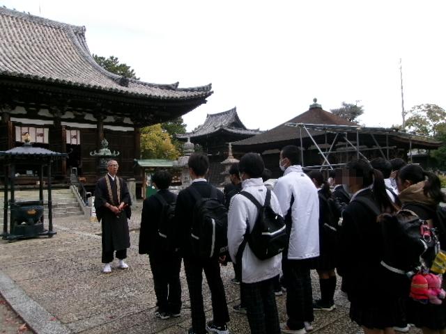 8年生が平和学習で、午前中、鶴林寺で行われている終戦80年企画展示「加古川 鶴林寺に残る特攻兵遺品・写真展」に行きました。最初から、鶴林寺のご住職様が案内してくださいました。鶴林寺は両荘と古くから農業用の水を通してかかわりのある地域であることをご紹介いただいたのち、戦争末期に出撃を控えた特攻隊員が宿泊しておられた中村屋旅館にあった忠魂碑が鶴林寺に移設されたこと、そしてなぜ本堂裏のひっそりとした場所への移設だったのかについてなど、教えていただきました。