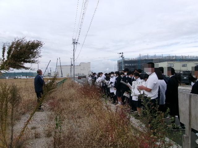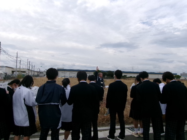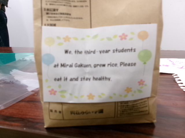 なかよし学園の中村雄一さんにお越しいただきました。中村さんは、両荘中学校時代から来ていただいている先生で、戦争が終わって間もない貧困国などで教育支援や食糧支援などの国際貢献をされています。私たちもこれまで、使わなくなった教科書や募金を寄附し、ダイレクトに国際支援につなげていただきました。今回ご来校いただいたのは、食糧支援に役立てていただくために、3年生が自分たちで作ったお米を直接中村さんにお渡しするからです。