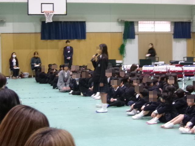 休憩時間を挟み、9年生が学年合唱「HEIWAの鐘」を歌いました。迫力があり、メッセージが伝わってくる素晴らしい歌声に、数年後のわが子の姿を重ねた皆様も多かったのではないでしょうか。最後は、全校合唱として、来賓・地域の皆様など大人も一緒に、「ふるさと」を歌い、この両荘らしいアットホームな雰囲気に包まれました。このような雰囲気を感じることができる子どもたちは、つくづく幸せです。。。