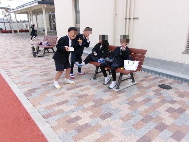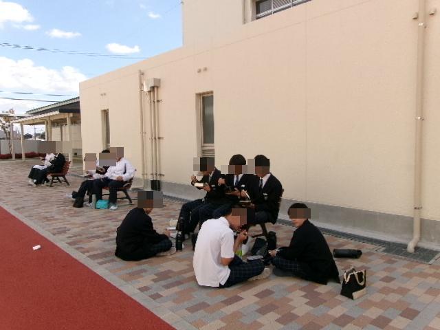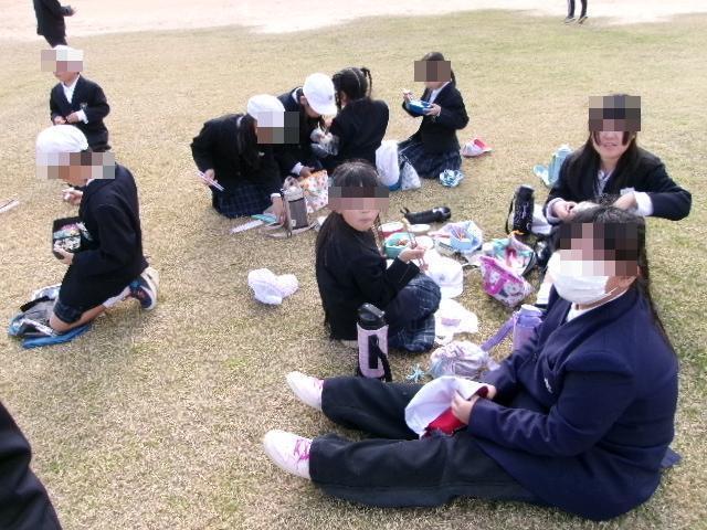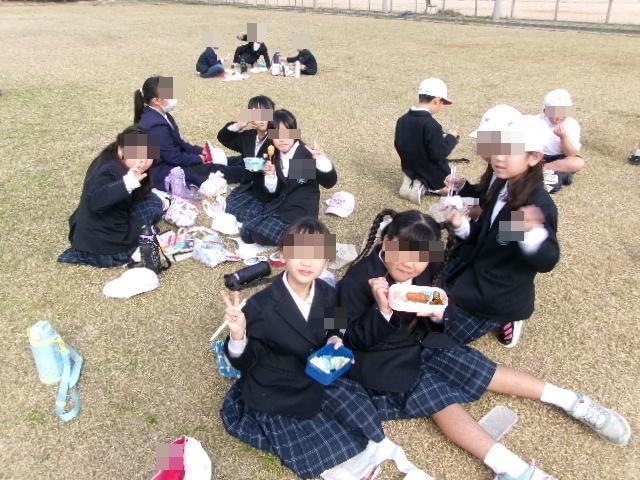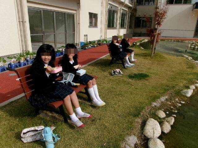 音楽発表会が終わった直後のお弁当・・・子どもたちも緊張から解き放されリラックスムード・・中庭、そして運動場で・・・