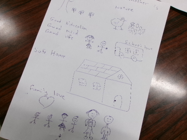 予定していた金塊発掘ゲームは、午後の雨で地面がぬかるんでいるということで、残念ながら中止。代わりに思い出の絵を描いていきました。