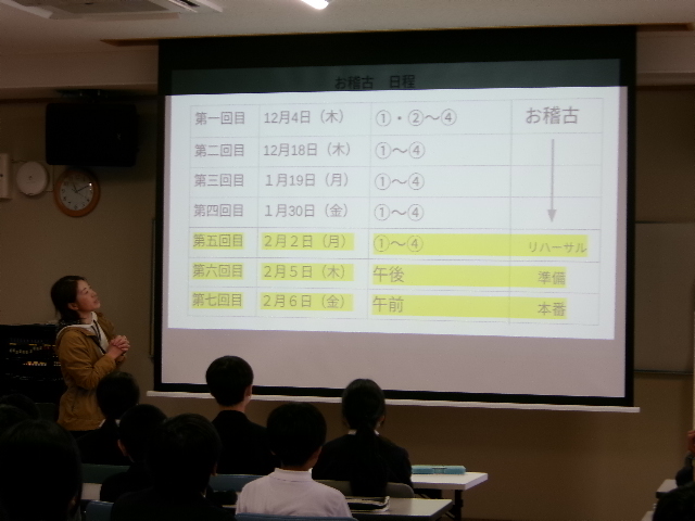 まず最初に、狂言学習の歴史・背景について、平荘小学校で長年取り組んできた経験をもつ先生が説明しました。平荘小学校出身者は小さいころからおねえさん、おにいさんの姿を見てきたイメージがありますが、上荘小学校出身者は昨年度初めてみた子どもも多く、この話でずいぶんと狂言についての理解が進みました。続いて、昨年度6年生担任で“みらい狂言”を経験した先生が、台本を配布し、役柄を決めるときの注意点について話をしました。この時点で子どもたちが狂言に対する気持ちがぐっと高まった瞬間でした。そして、最後には担任の先生から本番までの大まかな流れを説明しました。