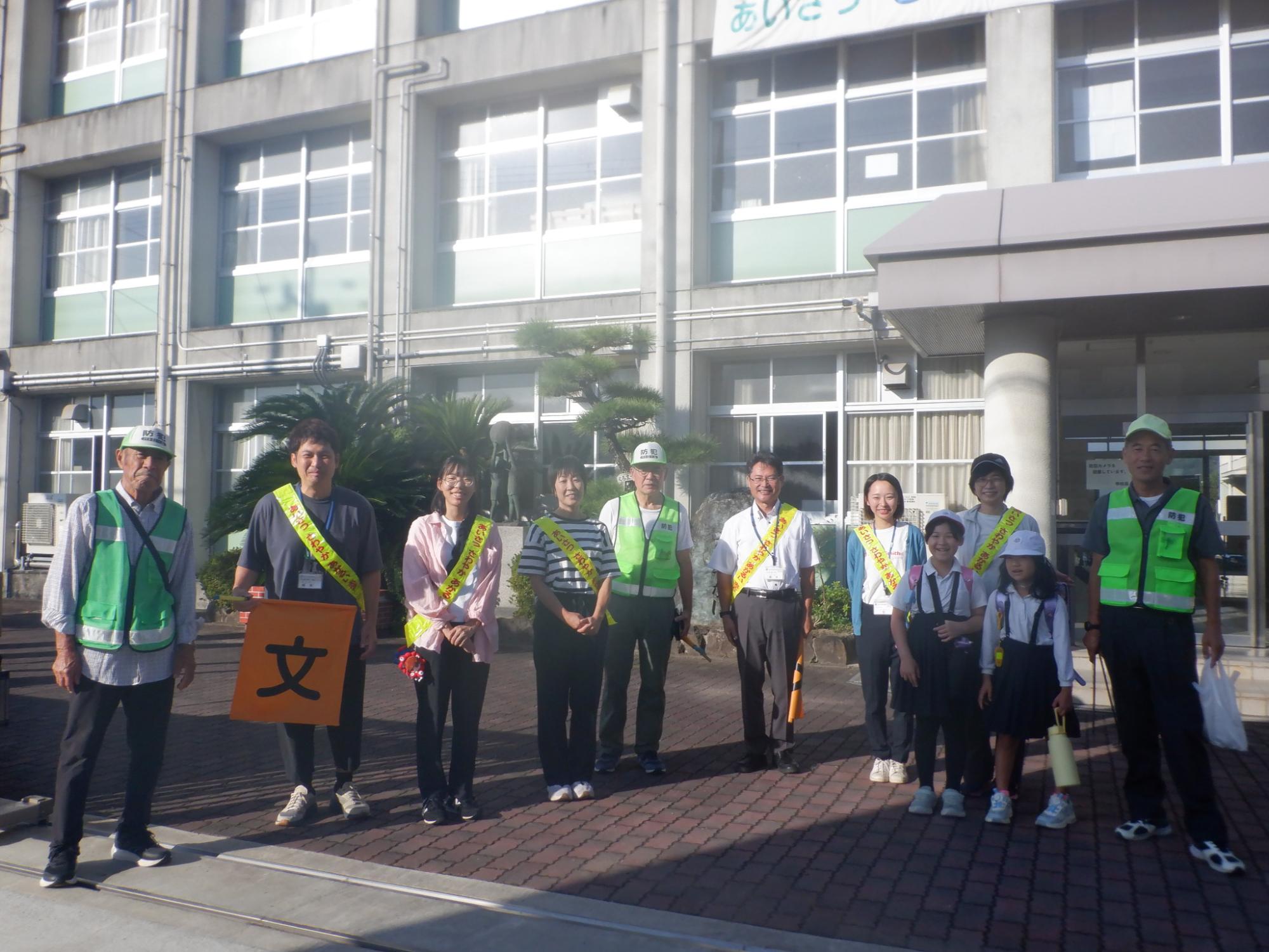 今日は10月1日、ユニットで設定している「笑顔であいさつにこにこデー」の日でした。今回より職員はにこにこデーのタスキをつけて登校指導をしました。ここ数年使用していなかったのですが久しぶりの再開です。タスキにある「あいさつ さわやか あかるい志方」の文字を見て、子どもたちはいつも以上にはりきって挨拶をしていました。最後に正門前で見守り隊の地域応援団の皆さんとともに記念撮影をしました。