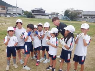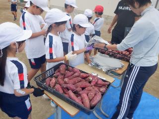 仕上がる時間となる業間休みには、全校生が外に集まりました。「焼き芋が食べられる!」の期待感いっぱいの様子、燻されたにおい、香ばしいかおりが漂い、ほかほかの甘い最高の焼き芋がどんどんできあがっていました。1人一本ずつ手に取りさっそく食べはじめました。「おいしい!」の大合唱でした。全校生が外で楽しそうに焼き芋を食べている姿にあらためて志方のよさが感じられました。