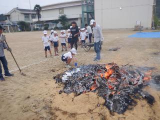 恒例の志方東の秋の風物詩「焼き芋大会」をしました。毎年お世話いただいている地域応援団の原政和さんに全面的にご協力いただき、同じく応援団の前田さんにも手伝っていただきました。1・2年生で芋を育てて、芋掘りをしました。前日には芋をきれいに洗い、今朝からは全校生分の芋をアルミホイルに包みました。いよいよ火の中に入れます。入れる時はちょっとドキドキ、火の熱さを体感しました。