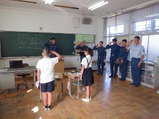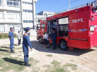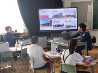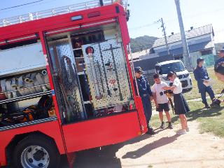 本日、3年生が社会科で消防士さんのお仕事について学ぶ「消ちゃん先生」に取り組み、志方分署等から6名の方にお越しいただきました。前半は画像とともに消防署の仕事や火災について学ぶ座学、後半は体験学習として、消防士の防火服を着たり、消火器の放水訓練や消防車見学をしたりしました。特に消防車見学では、いろんな道具が載せてあり、子どもたちはそれらに興味津々でした。児童数に比べてたくさんの消防士さんに来ていただけましたので、質問をはじめたくさんのやりとりを通して学習できました。