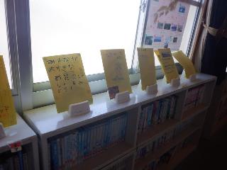 4年生国語「パンフレットを読もう」の学習で子どもたちが作ったパンフレットを只今図書室に展示しております。「パンフレットって何?」からスタートしたこの学習、最終的には発展として、個々もしくはグループでパンフレット製作に取り組みました。テーマは自由、自分の好きな分野をとりあげていました。何よりも「伝える」を意識してつくっていきました。アイスクリーム、世界陸上、サッカーのイエローカード、花、車、会社…、多種多様なパンフレットができあがっていました。中には今風にQRコードがついていて、「アンケートに答えてください」となっているものもありました。また、見ていただいた人にコメントをもらう欄がついているものもありました。図書室に来た人たちがぶらり見てくれています。