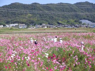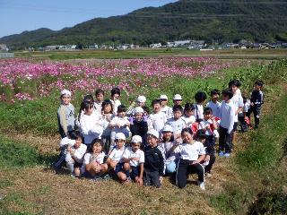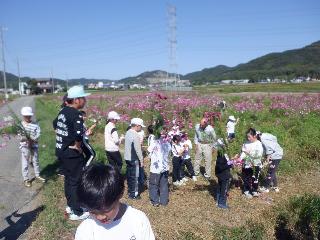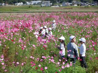 7月に2・3年生が種蒔きをしたコスモスが原政和さんのお世話で見事に育ち、今ではきれいなコスモス畑になりました。城山を背景に絵になる風景です。今日、1・2・3・4年生でそのコスモス畑を訪れました。地域の方々が応援に5人来られていました。今年は背の高いコスモスがたくさんありました。さっそく子どもたちはそのコスモス畑に入って走り回りました。背が高いのでかくれんぼにも十分です。広い畑の中を駆け巡り、思いっきりあそんでいました。後半はたくさんのコスモスを摘みました。約1時間、満足のいくまでコスモス畑を楽しみました。帰り道、どの子も摘んだコスモスをたくさん握って学校へと歩いていました。