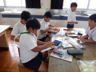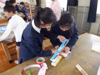 図工の工作で一人ひとりが手作りギターをつくりました。自分でデザインを考え、色を塗りました。カラフルな14種類ギター、全員分が今日完成しました。これは作るだけではないのです。何と、そのギターは今週の音楽会で活用します。3・4年生の発表である「県庁所在地ロックンロール」の歌の時はそのギターを身にまとい、弾く真似をしながらのりのりで歌うことになっています。今日の6校時、完成したばかりのギターを使いながら舞台練習をしました。これまではエアーギターでしたので、やはり「もの」があると勢いがちがってきていました。