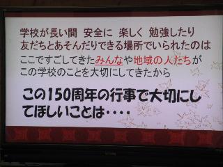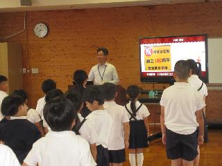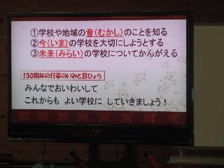 今日の朝会では令和8年度に本校が創立150周年を迎えることについて児童向けに話をしました。簡単に言えば「150歳の誕生日おめでとう」の行事であること、その節目を「児童、お家の人、地域の人たち、来賓、先生たちでお祝いすること」「学校が長い間、安全で楽しく勉強したり遊んだりできる場所でいられたのは、ここで過ごしてきた『みんな』や『地域の人たち』がこの学校のことを大切にしてきたから」等々。そして周年行事で大切にしてほしいことや目標について話をしました。「みんなでお祝いし て これからもよい学校にしていこう!となる行事」であり、「昔・今・未来をはじめ、学校のことを知って もっと大切にしていこうとできるきっかけとなる行事」であることを伝えました。最後にお家の人と一緒に考えてくる「150周年 キャッチフレーズ」(本日文書配布)について説明をしました。