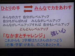 今日の朝会では、2学期のテーマ「なかまとチャレンジ」について話しました。仲間のなかで成長していく場が学校であることから、まず仲間の力で頑張った2学期前半の主な教育活動を写真で紹介しました。2年生がこども園児を楽しませた「おもちゃランド」、5年生の自然学校、少人数でステージに立って表現した先週の音楽会…。「ひとり」ではなく、「仲間の力」があったことで、勇気がもてた、踏ん張れた、やりがい・自信がもてた、たのしかった…を振り返りました。そして「ひとりの手」といううたの歌詞を追いながら、あらためて仲間の力について見つめました。最後に阪神タイガースの「仲間の力」にふれながら、「みんなの力で、自分がレベルアップ」「自分も頑張れば、みんながさらにレベルアップ」「みんながレベルアップすれば、自分もさらにレベルアップ」…どんどんと進んでいく。それが「なかまとチャレンジ」だと伝えています。