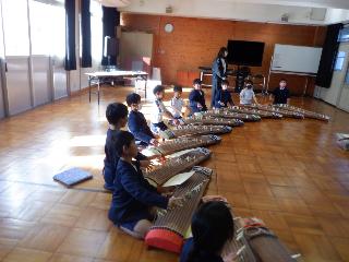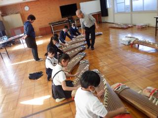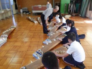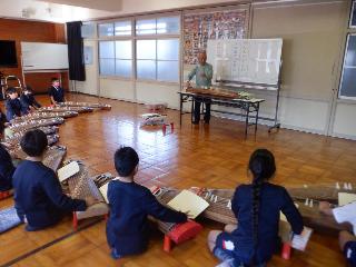 本日、昨年度もお世話になった姫路市の大原啓司先生を講師にお招きし、「箏教室」をしていただきました。1・2校時は4年生、3・4校時は3年・6年生、5・6校時は5年生でした。今回も本格的な箏を人数分ご持参くださいました。4年生の音楽の教科書には和楽器の学習があります。その一環での取り組みです。昨年度も教わった児童がほとんどでしたので、さらに発展するかたちでご指導いただきました。座り方、手の置き方、つめの動かし方…おさらいした後、「さくら」の演奏でさらに細かいところまで練習しました。たっぷりと体験でき、わずかな時間で最後には大原先生の横笛とコラボするかたちで「さくら」を演奏しました。手ごたえ十分の子どもたちでした。