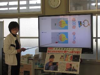 身体測定の前に、この11月は「目の健康」について養護教諭から保健指導を行っています。まず、近くを見る時に水晶体がふくらむ仕組みを図で確認しました。携帯ゲームやスマホをしているときは、至近距離が続いてしまいます。目がとっても疲れてしまいます。「長い時間近くを見続けないこと」「明るい部屋でみること」「ときどき休憩を入れること」さらには目のためにも「できるだけ外で遊ぶこと」等々を具体的に伝えました。そして児童用と保護者用のパンフレットも渡しています。それらをもとにご家庭でもお子様とともにお話しください。