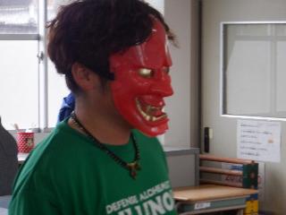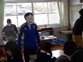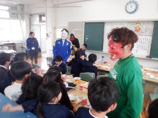 2月3日の給食時間、子どもたちはなんだか落ち着かない様子。そうなんです、この日は恒例の鬼がやってくる日になっています。期待と不安で「ざわざわ」が止まりません。給食終盤、ついにその時がやってきました。ドアを「がらっ。」なんと鬼が三匹もいるではありませんか。大喜び?で逃げる子、立ち向かう子、「きゃーっ きゃーっ」大賑わい。迫力満点の3匹の鬼たちは大活躍で帰っていきました。鬼たちは一体だれ???