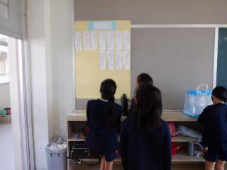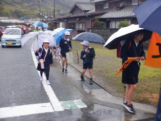 1年生の2日目がスタート。ただ、今日にかぎって朝から激しい雨。登校班に並んで来た子、お家の人と一緒に歩いて来た子、車で来た子、様々でした。雨の中、長い距離をお兄さんお姉さんたちと一緒に歩いて来たものの、つかれを見せずに元気よく「おはようございます!」が言えていた子もいました。8時過ぎには1年生全員がそろっていました。7人の1年生、教室ではクラスの仲間たちとさっそく楽しくおしゃべりをはじめていました。また、休み時間は上級生たちが気にかけて遊びに来てくれました。喜んでふれあっていました。よいスタートが切れています。
