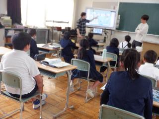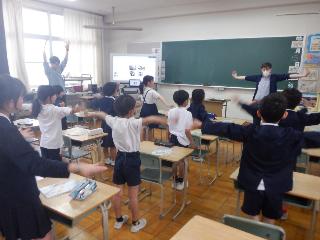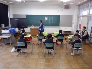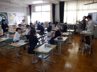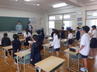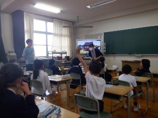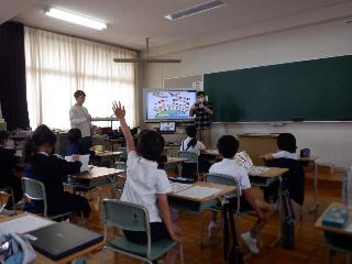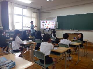 複式学級の4年生は3年生と一緒に「外国語活動」の授業をうけています。2つの学年が一緒の授業ということで、どちらの要素も混ぜながら合同の授業を組み立てています。3年テキストは「Hello」、4年は「Hello,world」世界の様々なあいさつに慣れ親しむ学習をしています。4年にとっては昨年のおさらいの学習に、3年にとっては次年度の予習になる要素も入れながら授業は展開していました。何よりも人数が多いことで、活気のある授業になっています。やりとりへの意欲は大きく膨らみますね。
