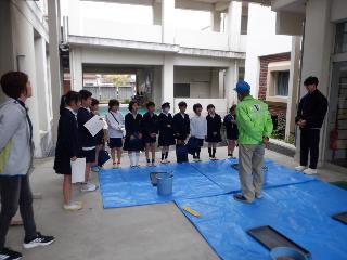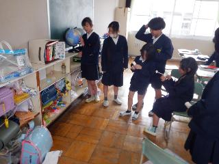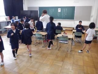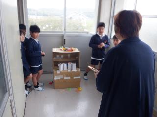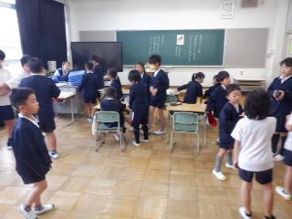 業間休み、子どもたちはたっぷりと遊んでいます。外あそびだけではありません。4・5年教室(廊下含め)での「射的」の催しも大盛況です。クラスの自主的な係(会社)活動のひとつです。今日も活気あふれており、下級生たち数人があそびに来ていました。2種類の会社が別々の射的コーナーを繰り広げています。一方は鉄砲形式、もう一方は弓矢形式です。先生たちも遊びに来ていました。来た人たちを楽しませることができて大喜びの子どもたち。よく遊んで、よく学んで、それがリズムのある学校生活につながっています。