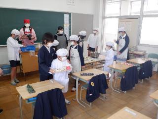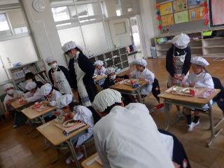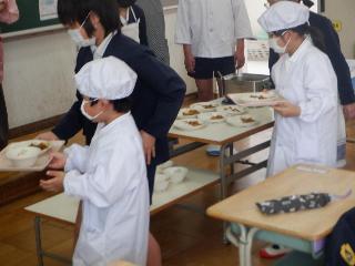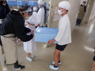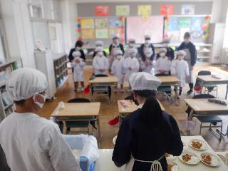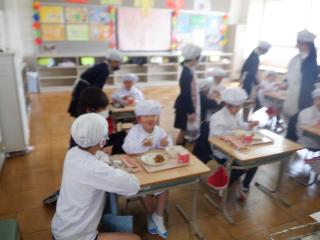 本日、1年生は初めての給食でした。朝から楽しみにしており、教室の給食当番表を見ながらやる気いっぱい。もちろん7名全員が給食当番です。3時間目ごろには「おなかすいた!」と待ちきれない様子。今日は6年生全員がサポートに来てくれました。エプロンをつけて、6年生と一緒に配膳室へとりにいき、みんなで運び、みんなで準備をしていきました。わかりやすく6年生がお手本を見せてくれて、やり方1つ1つを覚えていきました。6年生、ありがとう。スムーズに配膳ができ、さあ、食べはじめます。何と今日はカレーライス。うれしいメニューも手伝って、子どもたちはモリモリと食べていました。楽しい雰囲気で食べているので食欲も進むようでした。初回の給食がしっかり食べられると、明日のメニューが気になるようでした。楽しみが広がりました。