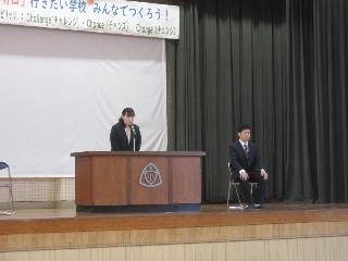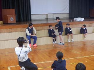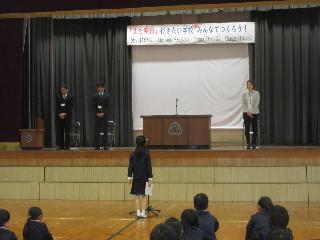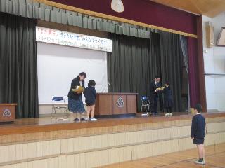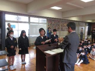 その後、児童会役員と学級委員長の選任式を行いました。名前を呼ばれた児童全員が「はい!」の素晴らしい返事ができました。新しい1年生も一緒の朝会です。「名前を呼ばれたら大きな声で返事をする」先輩としてのお手本を見せてあげることができました。これから1年生たちはどんどん学校のことを知っていきます。「あいさつは大きな声で」「休み時間は外で元気にあそぶ」「やさしくするのが当たり前」…等々、先輩たちの姿で1年生に伝えていってほしいと思います。先輩たちこそ身近な先生です。
