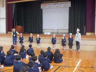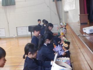 本日、「1年生を迎える会」を行いました。入学して7日目、1年生たちは元気に過ごせており、1日1日小学校生活に慣れてきています。この会では、2年生以上のお兄さんお姉さんたち全員で大歓迎の気持ちを伝えます。それに向けて計画委員や6年生たちが準備をしてきました。入場後、まず1年生ひとりずつの名前が呼ばれ、インタビュー「好きな食べ物」があり、つづいて6年生から手作りの王冠のプレゼントがありました。にこにこ顔の1年生、しぐさがとても微笑ましいものでした。続いて、○×クイズ。学校生活のことがクイズになっており、1年生たちにもよくわかる内容で楽しめました。代表児童からは、「これから一緒に過ごして仲良くなりましょう」というあいさつがありました。全校生わずか50名の学校、一人ひとりが大切な仲間です。みんなで仲のよいひがしっ子になっていきましょう。上級生たちの温かい気持ちは1年生の心に届いており、この日のお兄さんお姉さんたちの姿を通して、「これからの小学校生活頑張っていこう」という気持ちをさらに膨らませてくれたように思います。